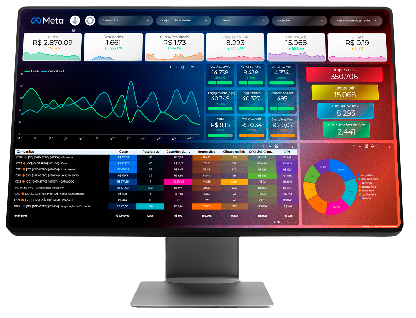✅ Apresentação visual impecável com métricas como ROAS, CTR, CPA, CPC, conversões e mais